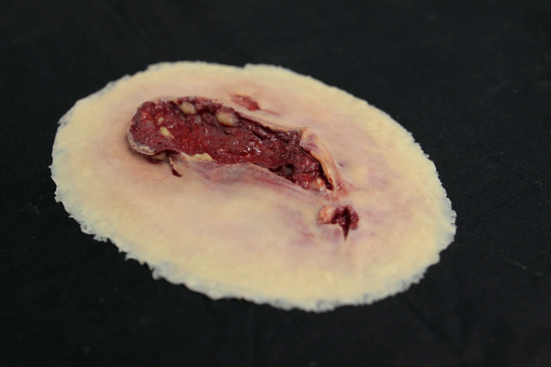 Techline Self-Adhesive Wound™ SW006: Laceration Wound–Large, represents laceration Wound to soft tissue, exposing fat and muscle tissue. Wearable wound simulation SW006 is ready for application right from the package without additional glue or adhesive. Wounds can be transferred from actor to actor, without any touch-up and reused multiple times.